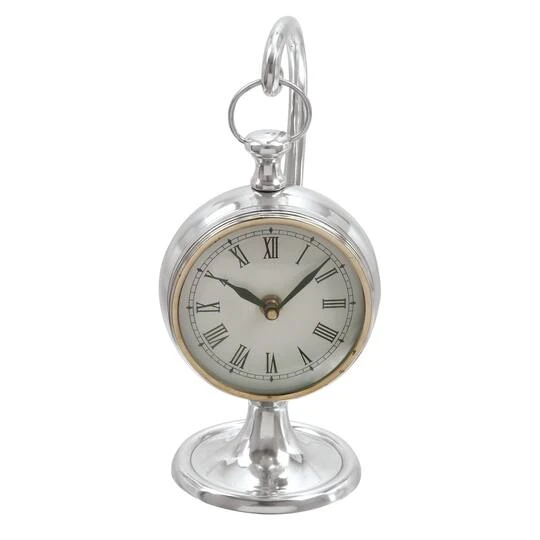 Whether you’re out to sea or on land, time flies by. This coastal-style clock lets you keep an eye on the time and add a nautical theme to your home office or bedroom. The round timepiece has an dazzling silver color is supported by an elegant hook-shaped stand. Black Roman numerals and hands stand out on the clock’s white face. Crafted in India, this tabletop clock is made of aluminum and features a wide circular base for stability and easy placement on a desk, bookcase, or nightstand. Designed with black rubber stoppers at the base that prevent scratching furniture and table tops, as well as sliding around.