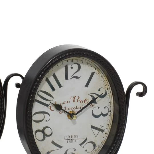 This 12″ Black & White Metal Oval Clock Set will work well in your living room side tables and even on your night stand or kitchen counters for a stylish time display and a timeless spell. Use the clocks to stylize an office, bedroom, or living room. Designed with iron band scroll attached to rounded block footed base for sturdy structure. Features iron peg feet. Designed with black rubber stoppers at the base that prevent scratching furniture and table tops, as well as sliding around.