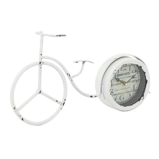 Pedal your way through time with this rustic 15″ White Metal Farmhouse Bicycle Clock. This decorative clock is ingeniously crafted into a bicycle-infused art piece that features a complete distressed white finish for that vintage vibe. Parked on your shelf or side table as a standalone décor or paperweight, this bicycle clock is a timeless piece for your coastal, shabby chic, boho, or any traditional-themed home space.