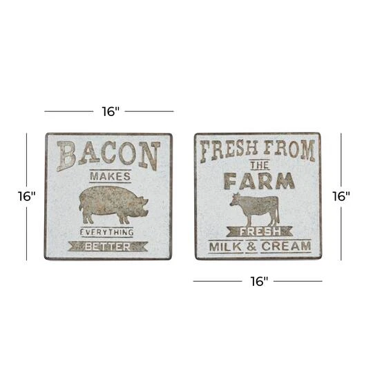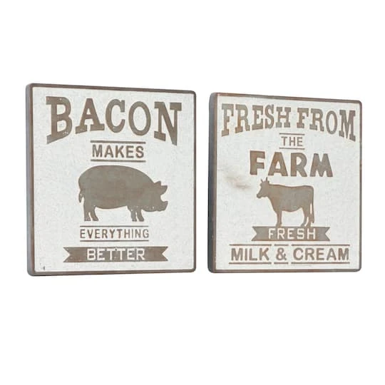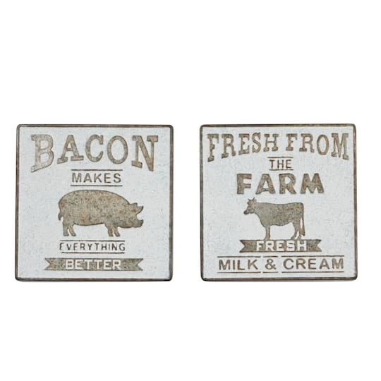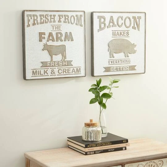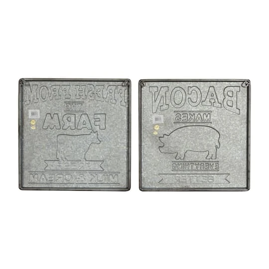 Farmhouse décor and bacon lovers alike will love this pair of metal wall pieces. Each square panel is made from galvanized metal with a silver-brown hue and soft white finish. The first sign reads “Fresh from the farm, fresh milk and cream” in large serif font with a cow illustration, and the second reads “Bacon makes everything better” with a pig illustration. Lightweight and ready to hang by metal hardware in the back, these fun accents are sure to liven up your kitchen.