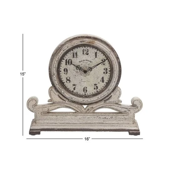 Placed on your console or coffee table, this 16″ White Distressed Wood Country Clock sure to be a timeless addition to your home or office. Showcased on your office or library shelves, tables, or consoles, this clock is sure make you on time for a style home. Display on your counter, console, coffee, or office table as an accent piece. Designed with black rubber stoppers at the base that prevent scratching furniture and table tops, as well as sliding around. Features 1 through 12 Arabic numerals and “Rue du Marche” typography.