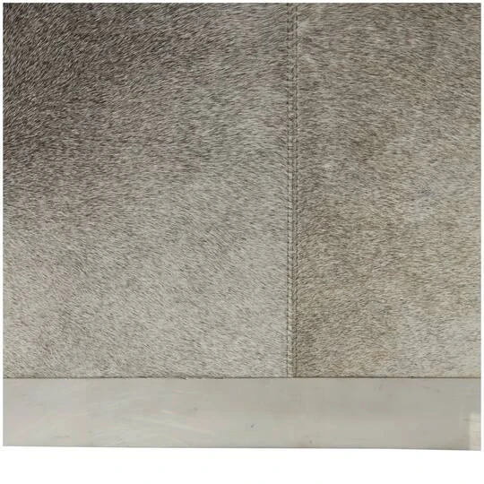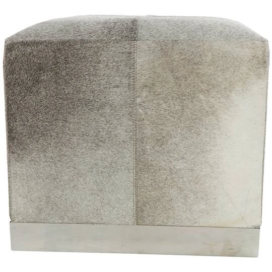 Embrace artistic expression with a style that highlights bold designs with sleek lines, neutral elements, and a minimalist aesthetic. Crafted from high quality leather, stainless steel and MDF, this contemporary pouf is designed for durability and filled with foam for comfort. Our gray and beige leather pouf has a natural textured finish and a sleek silver base that adds a touch of elegance to any room. Place this versatile leather pouf in your living room or bedroom for an instant upgrade, and use it for extra seating or as an ottoman. Leather and hair on hide are natural products, and therefore no two will be alike. There may slight variations in pattern, natural blemishes, colors, and overall aesthetic of the product.