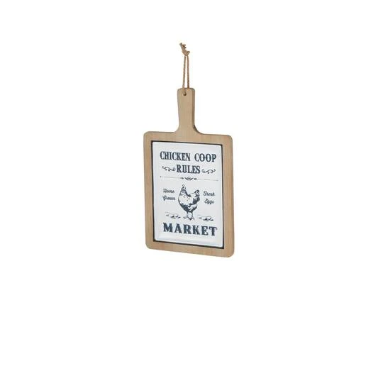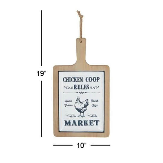 Add some farmhouse-style flair to your kitchen with this metal and wood wall décor. This sign features a rectangular iron plate within a Chinese fir wood frame. Typography near the top of the iron plate reads “Chicken Coop Rules.” Below that, you’ll find several other country-style phrases and an illustration of a chicken and its eggs. Use the jute rope hanger to add this décor to your kitchen or dining room wall, or allow it to stand on a table or shelf.