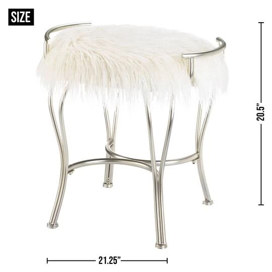 Add the finishing touch to your living room décor with this elegant silver faux fur covered stool. This stool features a soft white fur cushion and a silver base with intricate detailing. The white and silver coloring will coordinate effortlessly with a multitude of décor and add a subtle touch of sheen to any room. Use as a makeup vanity stool, desk stool, or as extra seating in the living room. This faux fur stool is made of iron, sponge, polyester, and MDF wood to create a sturdy and decorative home décor piece. Both functional and decorative, this stool will be a gorgeous piece for your home. Use as a comfortable footrest, stylish side table, or decorative accent to elevate your interior design! To clean the stool dust lightly or wipe with damp cloth as needed.