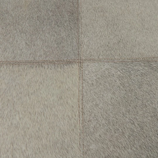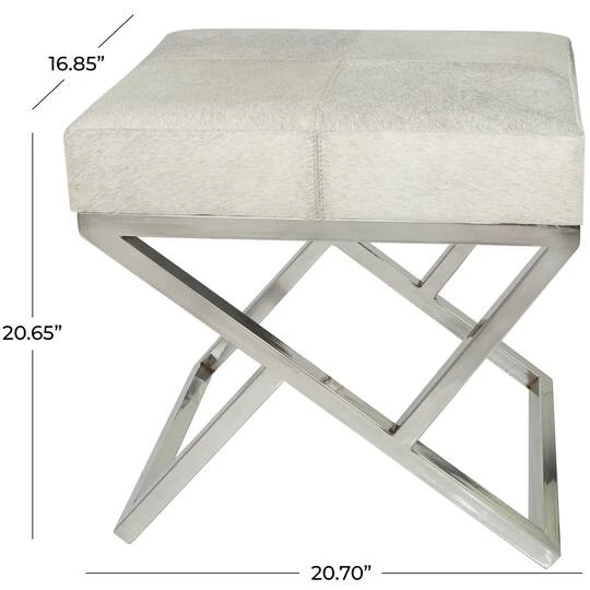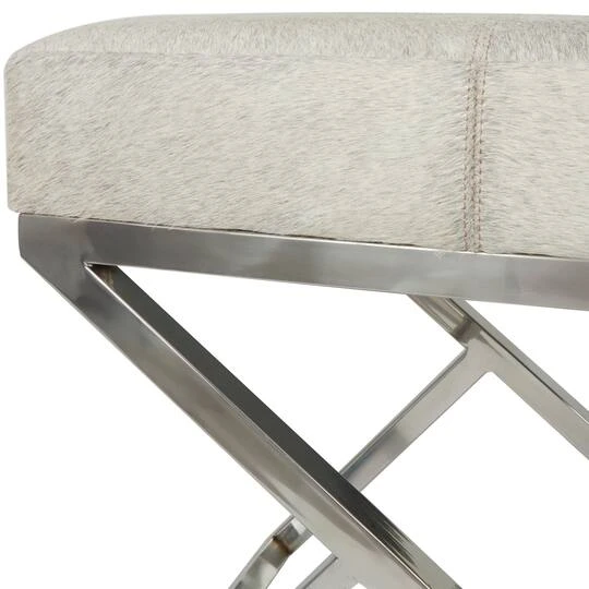 Embrace artistic expression with a style that highlights bold designs with sleek lines, neutral elements, and a minimalist aesthetic. Crafted from high-quality hair on hide leather, this stool offers both durability and comfort, providing a luxurious seating option atop stainless steel legs. The leather stool showcases a light gray color with a smooth and modern finish, and silver colored legs add a contemporary touch to any space. This stool features a low profile design that is perfect for extra seating in small spaces. To use the stool, simply place it in a living room, bedroom, or entryway as additional seating or as a stylish accent piece.Leather and hair on hide are natural products, and therefore no two will be alike. There may slight variations in pattern, natural blemishes, colors, and overall aesthetic of the product.