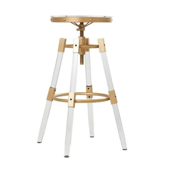 Indulge in the glamorous luxury of plush textures, dazzling details, and sleek finishes to elevate your home and add a sophisticated flair. This glamourous bar stool is made from a combination of iron and acrylic, creating a sturdy yet stylish piece of furniture. This gold matte-finished bar stool beautifully combines the elegance of gold with the transparency of clear acrylic seamlessly. A bar stool that captivates the eye, offers unique comfort, and embodies the essence of modern luxury. Place this unique stool at your bar or counter area for a chic and comfortable seating option that combines style and functionality seamlessly. Designed with felt or rubber stoppers at the base that prevent scratching furniture and table tops.
