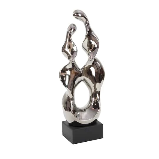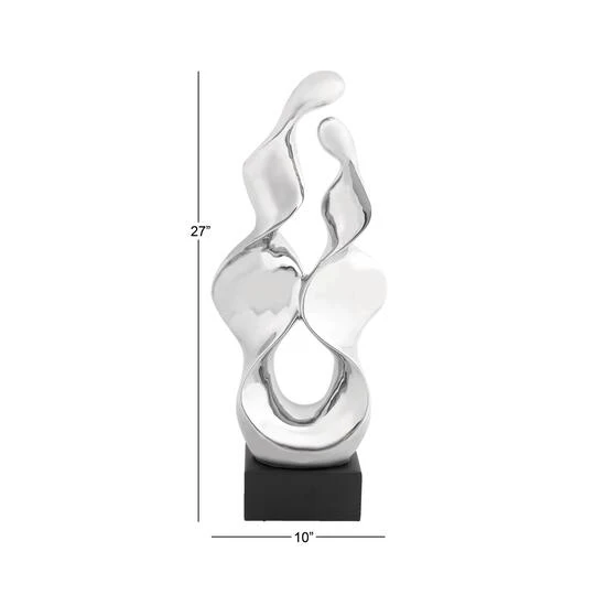The elegant movement and smooth, reflective finish of this 27″ Silver Ceramic Modern Abstract Sculpture is sure to bring a high brow art essence into any space. Two ribbon-like abstract swirls are molded by fired ceramic with an electroplated silver finish for a reflective metal look. This abstract formation is adhered to a black wooden cube base that elevates this silver sculpture in style. The base has rubber stoppers to prevent scuffs and sliding, ensuring your surfaces are protected. Wall-mounted shelves and large console tables make the best platforms for this trophy-like sculpture. Designed with black rubber stoppers at the base that prevent scratching furniture and table tops, as well as sliding around.