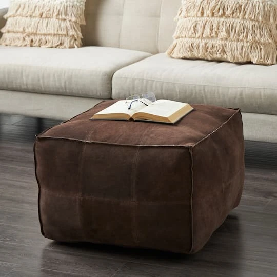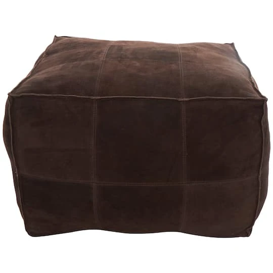 Crafted from high-quality leather with a cotton filling, this rustic pouf is designed for both durability and comfort. This stylish low-profile pouf features a patchwork design with exposed stitching, for an eye-catching piece that doubles as additional seating.