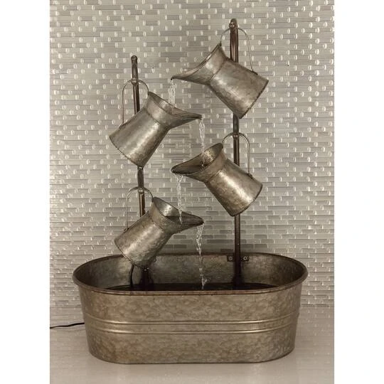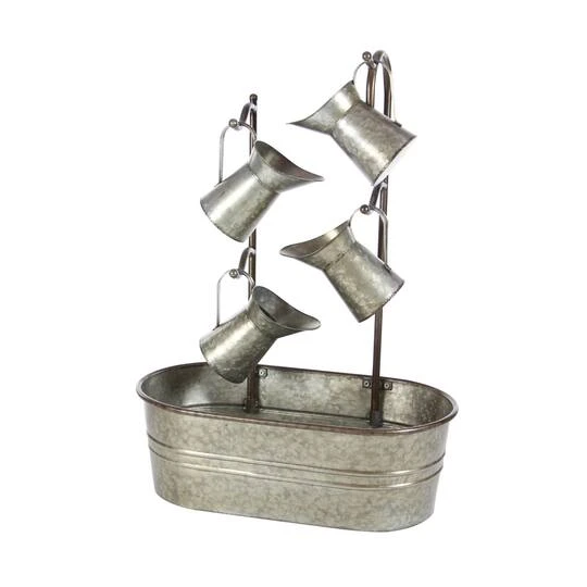 This rustic decorative fountain is an accent furniture that brings tranquility to your space by allowing water to pour smoothly, imitating the sound of a flowing river. Beautifully detailed, it features a distressed gray finishing, an oval basin, and four pitcher-inspired metal valves. This fountain is made out of metal with solid construction, offering durability and stability.