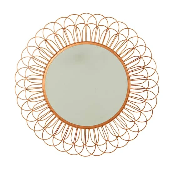 Inspired by modern design, this metal loop wall mirror lets the sun in. Metal in a brass finish has a circular mirror in the center. Hang above a table for a unique, elevated look. Trendy in design, this wall accent will look great in any room, creating a focal point for all who lay eyes. Standing 34″, easily hang in any space. Perfect for eclectic, boho, mid-century modern, and transitional home decor styles.