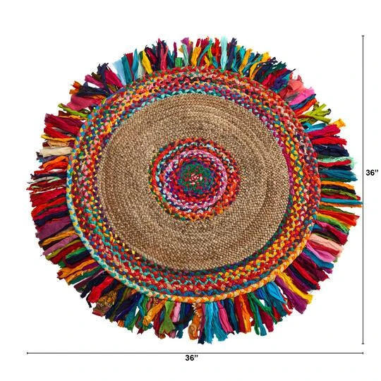 3ft. X 3ft. Handmade Woven Chindi Jute Rug With Colorful Fringe