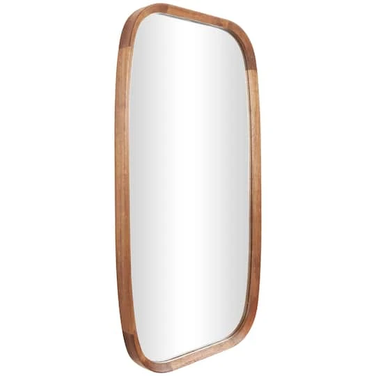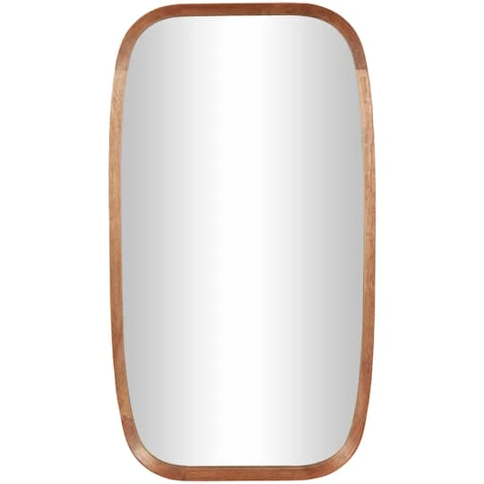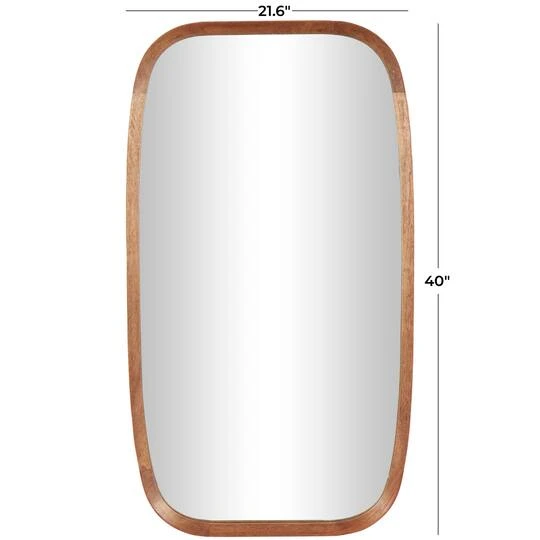 Inspired by sleek elegance and clean lines, a minimalistic design offers effortless luxury with monochromatic tones and bold, angular structures. Crafted from a combination of wood, MDF and glass materials, this mirror has a natural minimalistic style and features an oiled finish for a stunning minimalistic design. The simplistic design features rounded edges and can seamlessly fit into a variety of décor styles. The brown wall mirror can be hung in an entryway or above a mantle to add a stylish accent.