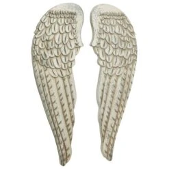 Dramatic, large angel wings wall art with a vintage style from their distressed white finish bring ethereal antique style to your home. This wood wall décor set has detailed carvings forming the feathers and accentuating the wings’ texture.