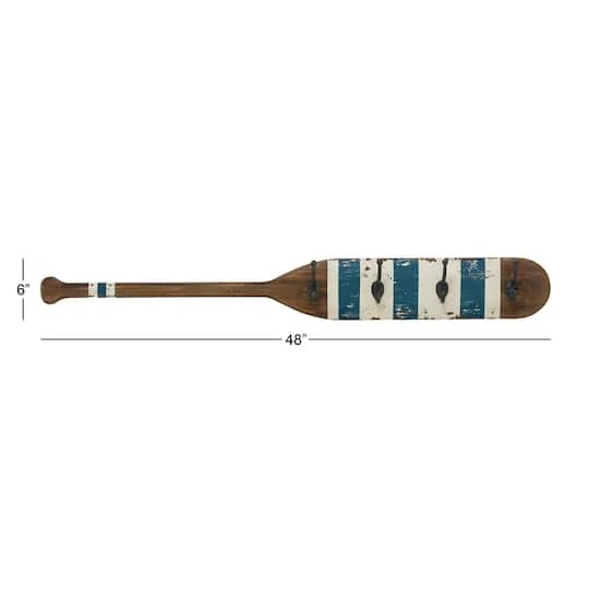 If you are a member of the varsity rowing team and are looking for a worthy memento, or are simply looking for the perfect home organization décor to complete your coastal-style home, this distressed wooden oar wall décor with iron hooks will surely do the trick. The oar is crafted with beauty and function in mind. The paddle painted with blue and white stripes in a distressed style for that vintage or coastal look. The metal hooks are securely fastened to the wooden oar for more secure organizing efforts in any room of your home. Each hook holds 5 to 8 lb.