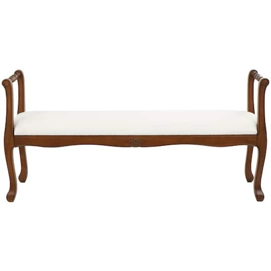 Designed with the essence of timeless sophistication, where rich old-world textures and warm hues come together for a refined classic taste of understated luxury. This entryway bench is crafted from foam and fabric with wood and MDF legs for added stability and support. Cream fabric arm bench has traditional details and a warm brown frame that adds to its classic look. Create additional seating in the home with this comfortable cushioned bench, featuring an elegant design that adds a touch of sophistication to any room. The bench measures inches, and weighs 33.4 lbs Use this cream bench as an accent piece in your living room or bedroom, or place it in an entryway or hallway to provide a beautiful seating option.