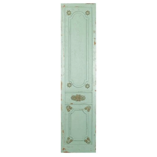 Welcome the charm of the past to your antique or vintage-inspired farmhouse living space with this long wooden wall décor. It resembles a door with a distressed green panel and is adorned with embossed acanthus accents.