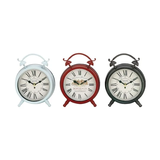 This 8″ Multi Colored Metal Vintage Clock Set will work well in your living room side tables and even on your night stand or kitchen counters for a stylish time display and a timeless spell designed with light pastel colors. One of these is the finishing touch for your bedside table, shelf, mantel, kitchen counter, or office desk. Three vintage-inspired analog alarm clocks come in red, white, and black with Roman Numerals. Designed with black rubber stoppers at the base that prevent scratching furniture and table tops, as well as sliding around.