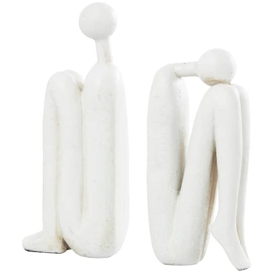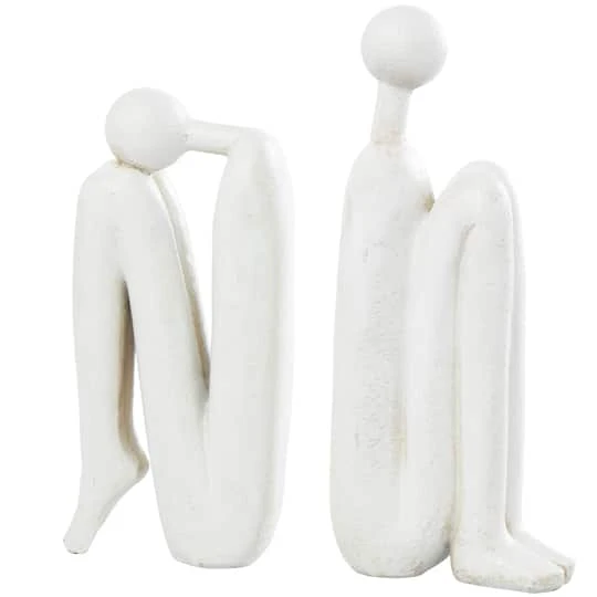 Embrace artistic expression with a style that highlights bold designs with sleek lines, neutral elements, and a minimalist aesthetic. A pair of abstract sitting people bookends crafted from solid polystone for a stylish and sturdy design. Unique and versatile in design, these playful book stoppers add personality and functionality to the home, and can also be used as a sculptural accent. Style these contemporary bookends together or separately as eye-catching desk, bookshelf, or console accent pieces, and use them to hold books or other objects in place. Designed with felt or rubber stoppers at the base that prevent scratching furniture and table tops, as well as sliding around. Polystone bookends make a great gift for any occasion.