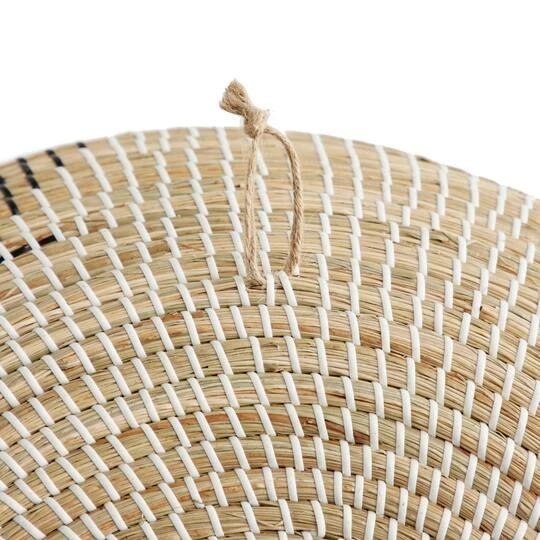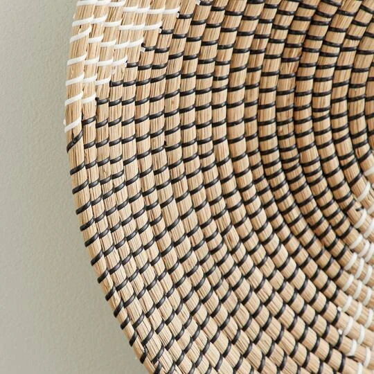Bring natural and eclectic styles together in this Beige Natural Contemporary Abstract Wall Decor Set. Each round seagrass wall art piece features sun-dried seagrass strips coiled into round trays with thin black and white plastic strips woven to form a striped swirl pattern. Handmade in Vietnam, this accent decor set works in coastal, contemporary, and eclectic styled spaces. Due to the handmade nature of this item, no two will be alike, there will be slight differences in shape, size, and color.