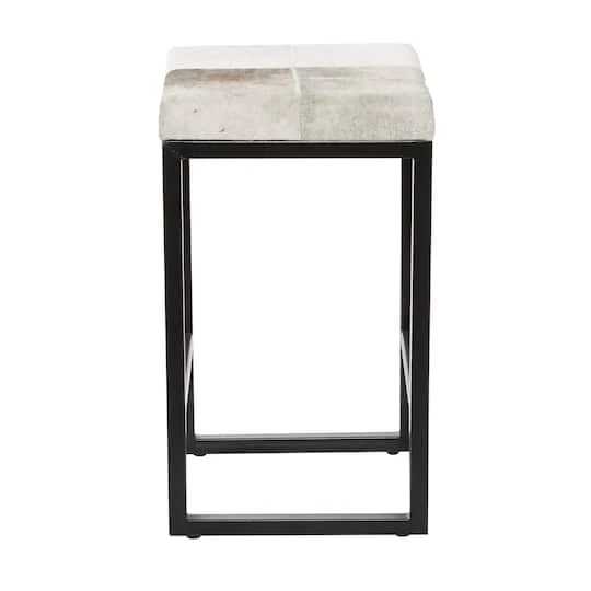 Great for adding additional seating with additional charm this counter stool has it all. Pull up to your kitchen counter, table, or desk in style with this counter stool. Easily goes with neutral and pastel-painted console or dining tables. This item comes shipped in 1 carton. This accent stool features a leather hide seat cushion. Suitable for indoor use only. Leather and hair on hide are natural products, and therefore no two will be alike. There may slight variations in pattern, natural blemishes, colors, and overall aesthetic of the product. Maximum weight limit is 250 lbs. Made in India. Designed with an industrial theme.
