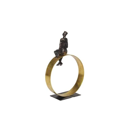 Lightweight, textural black resin is sculpted into a human man figurine looking up at the sky and sitting atop a large, metallic gold circle. The figurine and gold circle statue are adhered to a solid, flat, rectangular black iron base. The male figure’s body and silhouette is textural and detailed with a semi-gloss black paint with decorative metallic gold accents. The flat circle statue the man is seated on top of is a very bold, metallic, rich gold with a dimensional texture. This sculpture will add some style in your modern style living room when displayed on coffee tables or side tables. Designed with rubber stoppers at the base that prevent scratching furniture and table tops, as well as sliding around. Wipe clean with a dry cloth. Suitable for indoor use only. Modern design. This item comes shipped in one carton.
