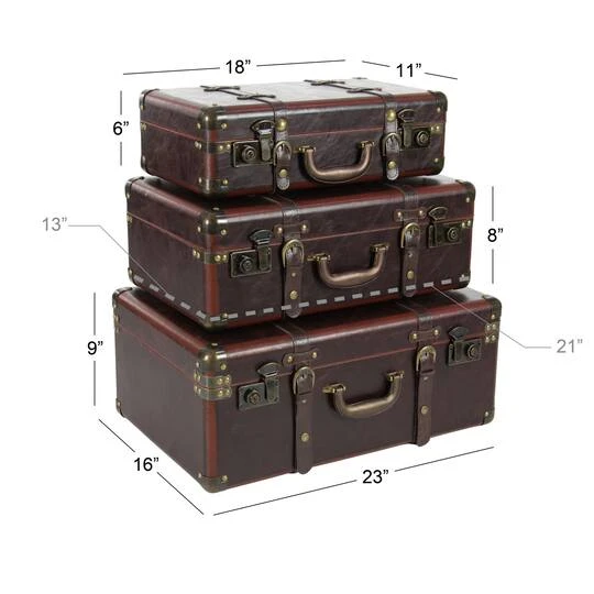 In your entryway, hallway, kitchen or bedroom, add some storage with some style with these trunks. Great for out of season coats, purses, bookbags, and scarves, these trunks are as functional as it is stylish. This storage trunk set serves both decorative and functional purposes and can be stacked together or display separately in vintage-styled space.