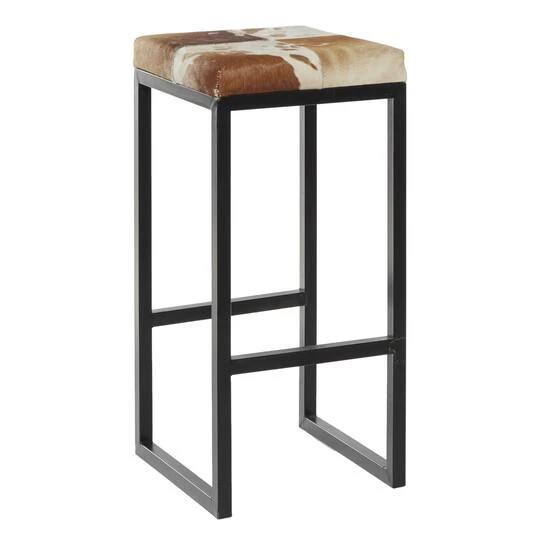 Make your friend thirsty with envy with this stylish bar stool. Pull up to your home bar, counter, and bar table in style with this bar stool. This stool offers comfortable seating at a kitchen island or home bar. This item comes shipped in 1 carton. This accent chair features a cowhide leather seat cushion. Suitable for indoor use only. Leather and hair on hide are natural products, and therefore no two will be alike. There may slight variations in pattern, natural blemishes, colors, and overall aesthetic of the product. Maximum weight limit is 250 lbs. Made in India. Designed with an industrial theme.