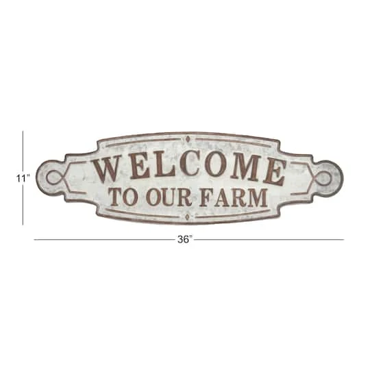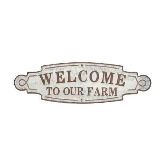 Transform your existing farmhouse, vintage, or rustic-inspired home with this horizontal “Welcome To Our Farm” wall sign. It showcases a champion belt-like shape with borders in a distressed brown finish and a light gray ornate paneling on the background. This wall sign is made of iron and is a suitable display signage for any color scheme and rustic-themed furniture or background.