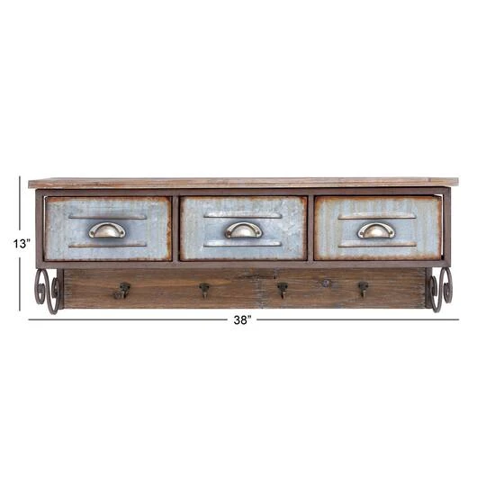 Organizing isn’t boring when you have amazing wall shelves to fill. Whether used as a focal point, or to display your favorite things, this wall shelf it the perfect addition to any home.Hang in entryway for farmhouse style with functional home storage and display options. This item comes shipped in one carton. There are keyholes on the back for easy hanging. Suitable for indoor use only. Holds up to 20 lbs. This wall shelf features 3 metal drawer shelving units and 4 hooks; can hold 20 lbs. maximum. Farmhouse-themed style.