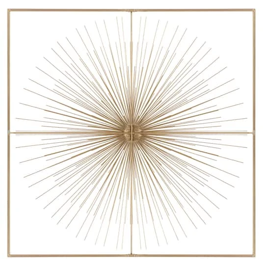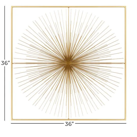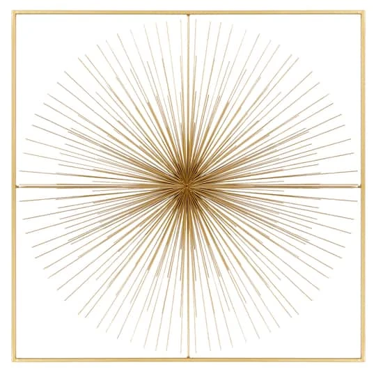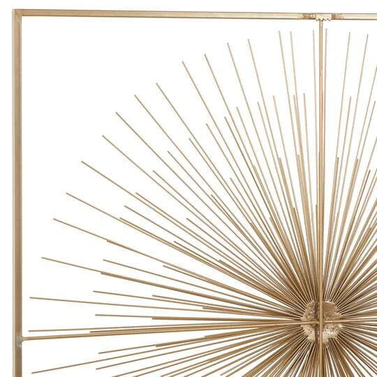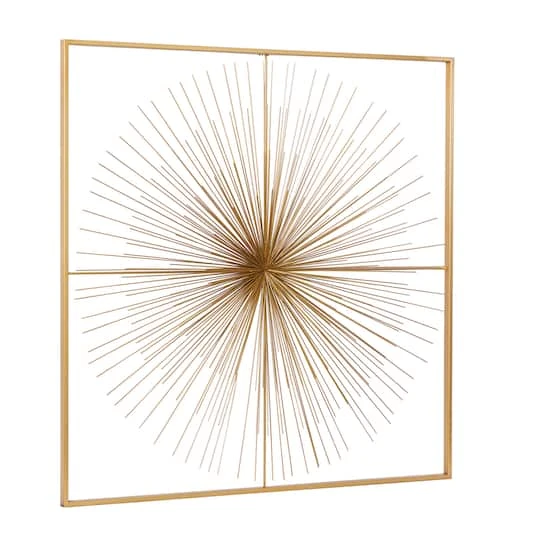 Add a show-stopping piece in glam-style homes with this metal wall décor. Handcrafted in India, this extra-large wall decor made from iron features a large starburst structure in a square frame with a metallic gold finish. Stylish yet lightweight, it easily hangs on walls of living rooms and bedrooms to elevate the charm and appeal of modern and glam-style homes.