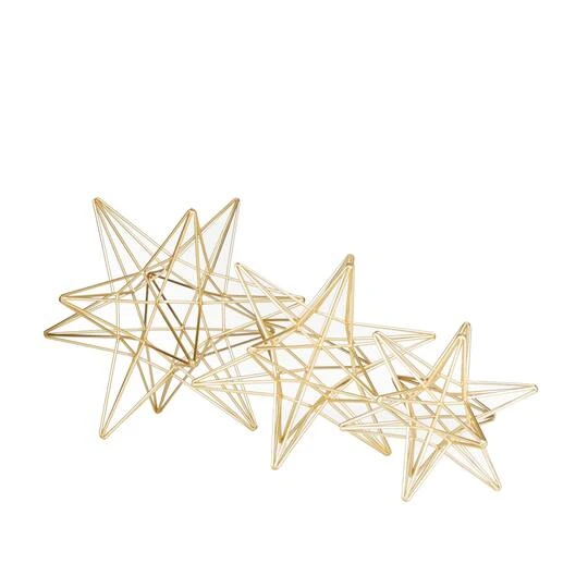 Add a hint of glam on your coffee or console tables with these gold star table decor set to elevate your indoor aesthetics. Create a balance surface space and added dimensions with this beautifully crafted sculpture. An artistic display to showcase your personality and enhance the look of any open table top space. These items come shipped in one carton. Suitable for indoor use only. Made in India. Set of 3 star table sculptures. Glam design.