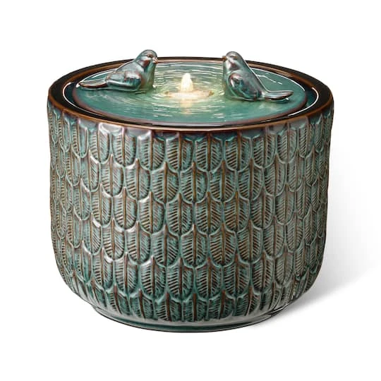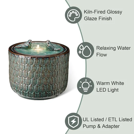 Create a calming oasis that brings an artistic touch to your space with this chic ceramic fountain. It features an elegant glaze finish that shows the charm of kiln-fire. With water flowing across the front wall and spilling into the bottom basin, the soothing sound of cascading water helps to create a relaxing atmosphere. This versatile fountain will be a delightful addition to any of your garden, patio, deck, porch or home spaces.