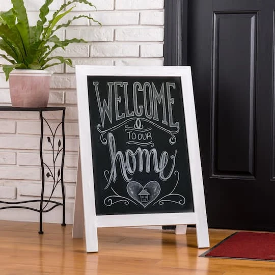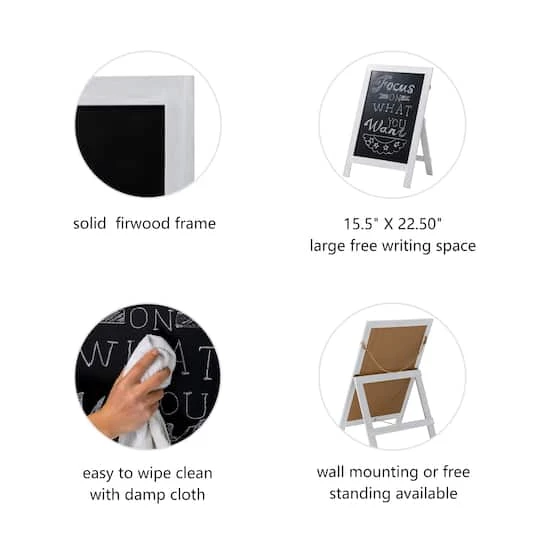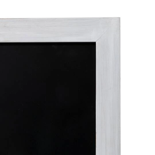 This wood chalkboard décor features a white natural firwood frame and a chalk board. The hemp rope and support foot on the back help it to convert from a wall decoration to a floor decoration and back. Approximately 348.75 sq. in. of erasable surface area provides ample room for writing and decorating. This chalkboard sign works perfectly with traditional chalk and chalk markers. The premium black surface provides a perfect background for vibrant ink colors to show off your chalk writing skills. The support legs fold flat for portability and compact storage. This chalkboard wipes clean with a damp cloth without any ghosting or stains. It’s designed to be used on sidewalks or in kitchens, restaurants, bars, homes, or weddings.