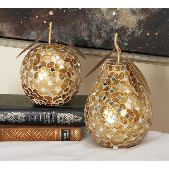 Tickle your creative appetite inside the dining room with this set of mosaic fruit décor tinted in gold and detailed with a glass mosaic. Each of these metal fruit sculptures is adorned with gold finish and ornate mosaic glass tiles. Its complex and lavish craftsmanship creates a classically baroque feel that adds a finishing decorative touch to your home. This classic and traditional apple and pear mosaic sculpture set is the perfect accompaniment to your dining table centerpiece. Both pieces come designed with black rubber stoppers at the base that prevent scratching furniture and tabletops and keep them from sliding around. This set includes 2 decorative sculptures and comes shipped in one carton. Made in India.