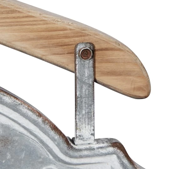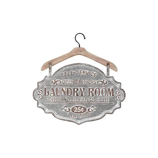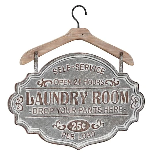 Charmingly cheeky, this vintage-inspired metal wall decor sign adds a down-to-earth touch to your Farmhouse-styled space. Featuring an antique emblem silhouette, the metal sign is made from galvanized silver iron with decorative whitewashing and rust for texture and dimension over the bold lettering. This decorative sign is secured to a lightly whitewashed Chinese fir wood coat hanger, which also serves as a sturdy hook to hang on your laundry room wall or rack.