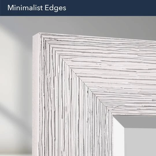A wonderfully textured, chrome-colored polystyrene frame, perfect for modern living spaces, brings an elegant touch to any home. This piece’s beveled edge construction elevates the piece’s luxurious and sophisticated allure and catches the light, reflecting it back in colorful shimmers against the glass.
