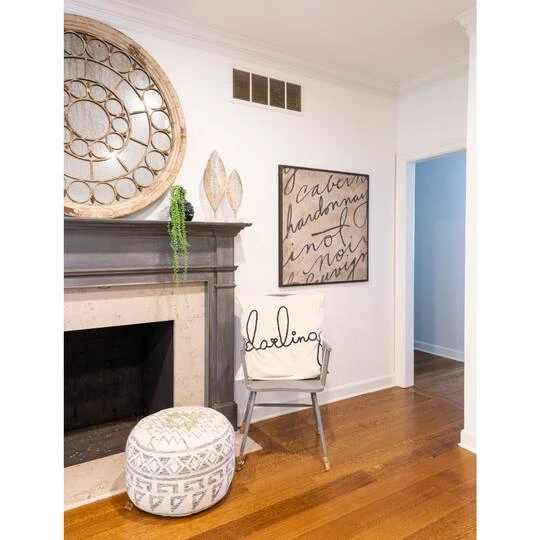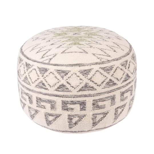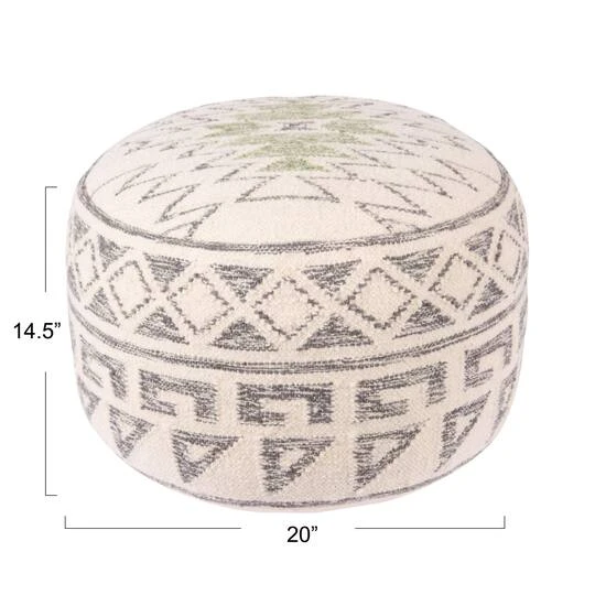 This versatile gray, cream, and green pouf is the perfect piece for any room. Kick back, relax and let your worries melt away with its soft colors and beautiful texture. The circumference provides enough room to use as an extra seat or just an extra place to prop up tired feet.