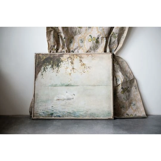 This artwork features swans enjoying a swim on a perfect fall day. The distressed finish along with muted colors make it a perfect addition to a vintage décor. The large size makes it a centerpiece to the room for all to enjoy.
