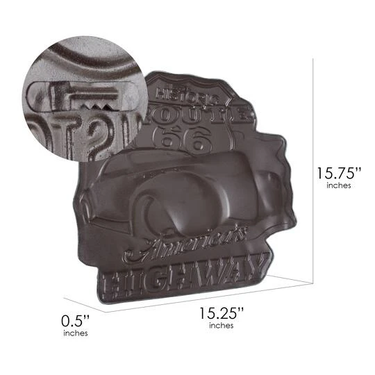 Get your kicks on historic Route 66 with this vintage-inspired metal sign that pays homage to classic Americana culture. Emblazoned with red, white and blue, the stars and stripes, as well as a classic American car from days of yesteryear, this embossed metal sign makes for a great piece for your garage, auto shop, man cave or home bar. Or maybe you’re a collector of all sorts of signage; so why not add to your collection. Plus, with an embossed effect that gives the piece a bit of texture, depth and dimension, this sign is sure to shine from your wall and make for an attractive addition to your wall décor needs.