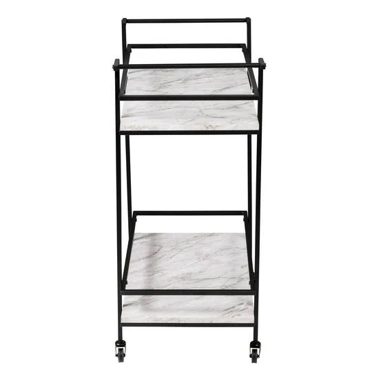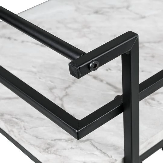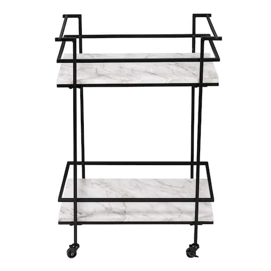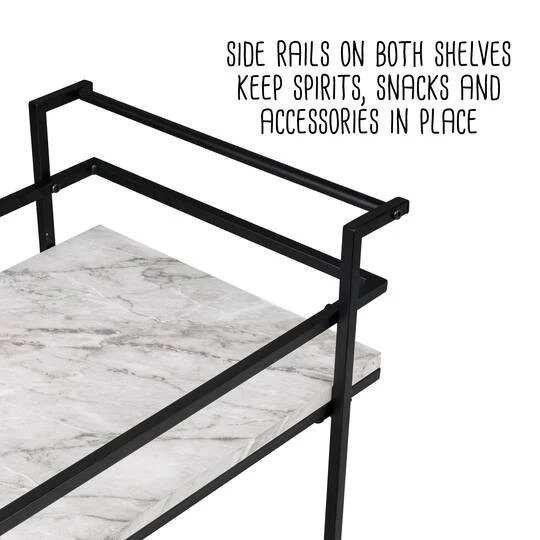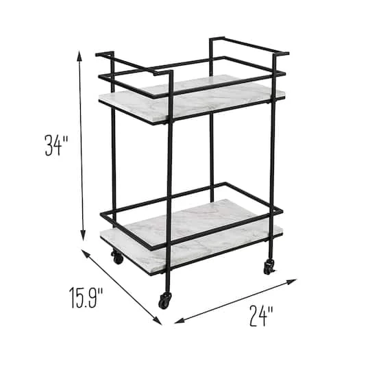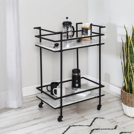 This 2-tier faux marble multi-purpose bar cart is the life of any party as it stylishly makes its way from room to room, and when it gets there, two of its rubber casters lock to hold it firmly in place. Two roomy shelves can handle anything from spirits and shakers to glasses and bottles, with the occasional snack thrown in for good measure. Its sturdy frame includes rails on both shelves to keep everything securely in place. And as Saturday night blurs into Sunday morning, it doubles as a coffee cart or an everyday kitchen cart in the busiest room in your home.
