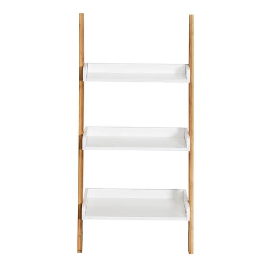 This 3-tier leaning bathroom ladder shelf is the perfect storage option for your bathroom. From cotton balls bath towels, it keeps your daily essentials within reach and looks good doing it. Its bamboo base and white shelves fit any bathroom décor. Bathroom storage that both looks and functions just like you want it to.