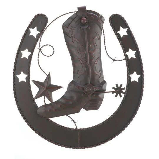 Add some Western style to your wall with this cool cast-iron cowboy décor. A classic cowboy boot with spur rests inside a large horseshoe, surrounded by stars and a little bit of barb wire.