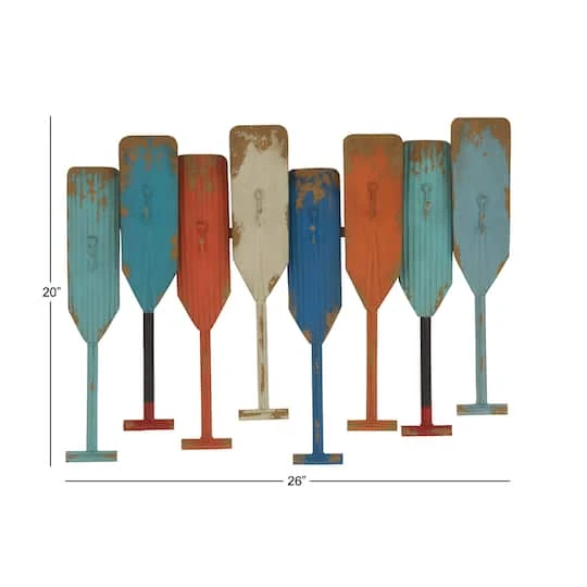 Brighten up your coastal or lake house with this stylish and functional coastal decor wall hook rack. Finished with textural distressing, this iron wall rack has 8 same-sized oars in a zig-zag staggered pattern, all firmly adhered to a horizontal metal bar. The entire home decor piece is made from long-lasting lightweight iron, however, the distressed, chipped-paint look gives the aesthetic feel of vintage wood. Beneath the distressing, a soft rust-brown color peeks out from beneath the lively colors of light aqua, dusty turquoise, vermilion, sandy beige, royal blue, orange, seafoam green, and a blue-gray. Each oar has a welded metal hook to hold keys, jackets, towels, aprons, or mittens.