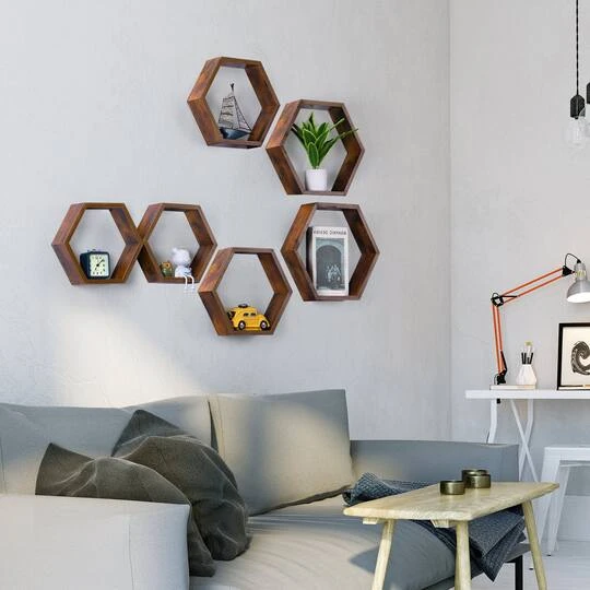 The hexagonal honeycomb floating shelf set is made of natural and high-quality wood. The smooth, rich finish and texture give the shelves a rustic look, while the unique shape provides a modern style that catches the eye. This shelf set is compatible with a variety of decorative styles and can hold all your small décor pieces, collectibles, or knick knacks.
