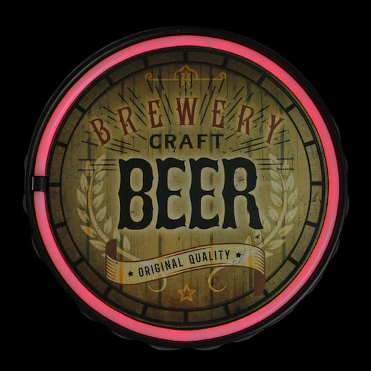 Light up your window man cave or bar with our modern neon style lighted wall decoration! This unique brewery craft beer sign is surrounded by red neon rope lighting. It comes ready for hanging with a keyhole hook on the back and requires 4 AA size batteries or a micro USB cord.