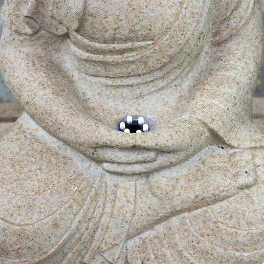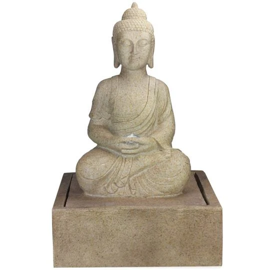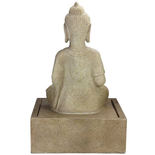 Relax to soothing falling water and visual beauty of design using this water fountain in your gardens. This majestic cascade of water lends an extraordinary look to your lawns or gardens. Water pours up through the lighted hands of Buddha, cascading over his lap into the basin creating a calming and serene surrounding. Fountain is finished in faux stone, perfect for any garden setting.