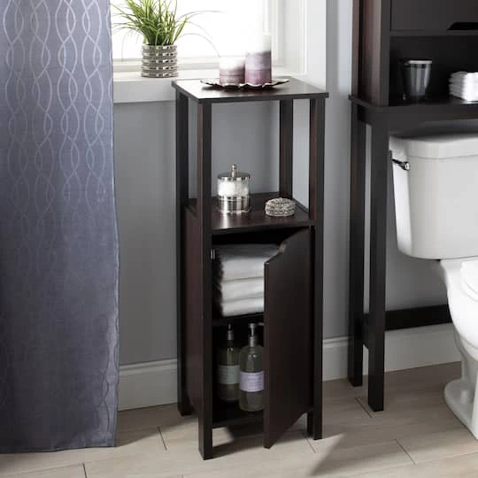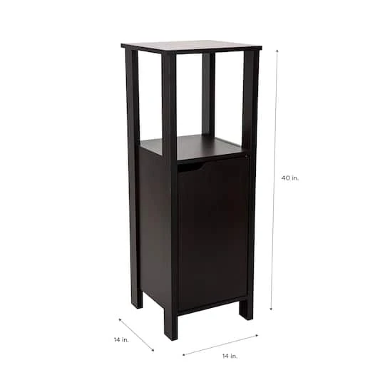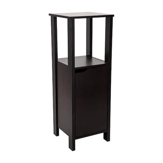 Add this stylish Organize It All Floor Cabinet to any room for extra storage space. With 2 shelves inside, this cabinet can hold many essential items. The open shelf is perfect for decorative items. Put in your bathroom to store towels and toiletries or the living room for blankets. The espresso wood finish is very traditional and will look great in your space.