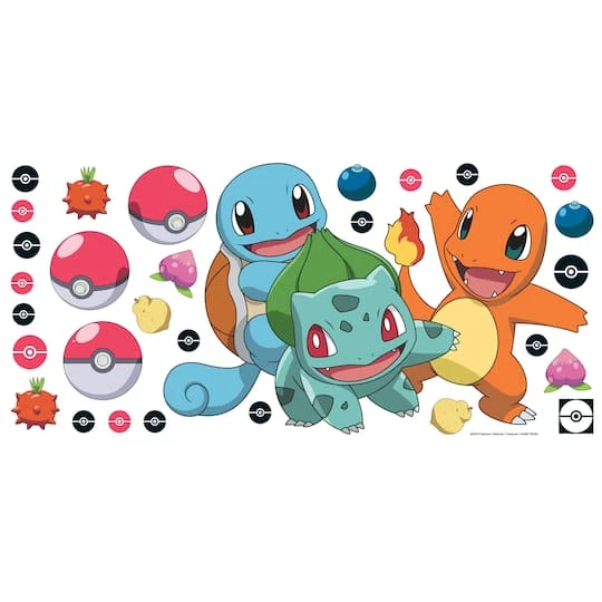 Make a wonderful dream a reality with this set of officially licensed Pokémon peel and stick wall decals! Featuring a Charmander, Bulbasaur, and a Squirtle, along with berries and Poké Balls, this set of renter-friendly and removable decals installs in just Peel, Stick, Done!™