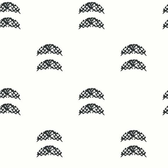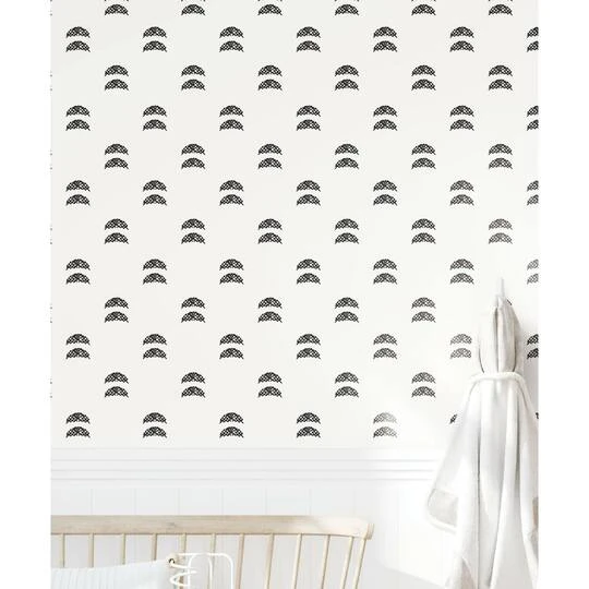 Stencil crosshatch style half circles stacked in duet in offset lines appear sketched with mottled ink in Half Moon peel and stick wallpaper by Rose Lindo for RoomMates.