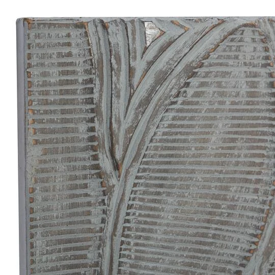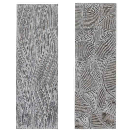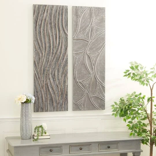 Made in India, this two-piece wood panel decor brings sophistication and dimension to a room. No matter where you hang them, these stately wood art panels draw attention. A closer inspection reveals intricate grooves that form natural-looking patterns on each panel. This set of wall art has a neutral palette that fits into a variety of decorating schemes. Hang the panels in an entryway to greet guests, or place them in a living room to elevate the room’s look. Keyhole hangers for easy placement. Suitable for indoor use only. This is a 2-in-1 set of rectangular wall Decor. Modern theme. This item comes shipped in one carton.